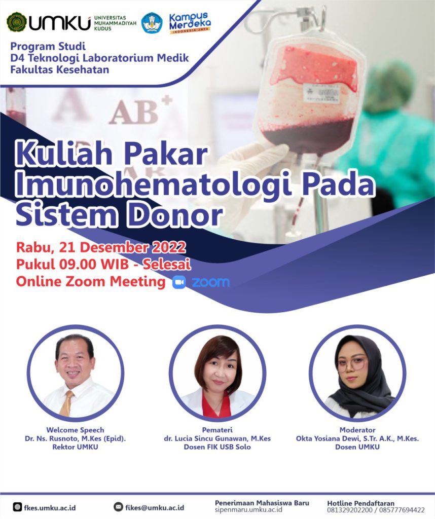 Mimbar Ilmiah kali ini diselenggarakan oleh Program Studi D4 Teknologi Laboratorium Medis Universitas Muhammadiyah Kudus (UMKU). Panitia mengambil tema Imunohematologi Pada Sistem Donor.