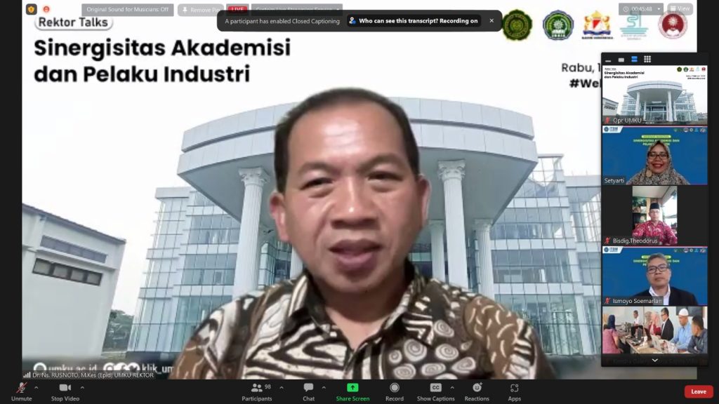 Rektor UMKU sebagai salah satu pembicara mengangkat tema program kemitraan kampus dengan pelaku UMKM. Dalam materinya, beliau menyebutkan “Era Digital membuat perubahan di dunia kerja berjalan sangat cepat, dunia kampus memiliki kecepatannya sendiri, karena itu diperlukan sinergitas, Perguruan Tinggi harus lebih adaptif dan fleksibel dengan dunia kerja, dunia usaha, dunia industry” ungkap Dr. Ns. Rusnoto, SKM, M.Kes (epid). Ia juga menambahkan bahwa inovasi pengelolaan perguruan tinggi dengan duani industri tidak boleh berdiri sendiri-sendiri. Program kemitraan yang coba digagas dan dikelola harus mampu menambah daya saing lulusan, kemajuan kampus dan juga pelaku usaha. “Jika dunia industry dan kampus mampu menciptakan produk dengan lisensi sendiri, maka kemandirian bangsa pasti akan terwujud” pungkasnya.
